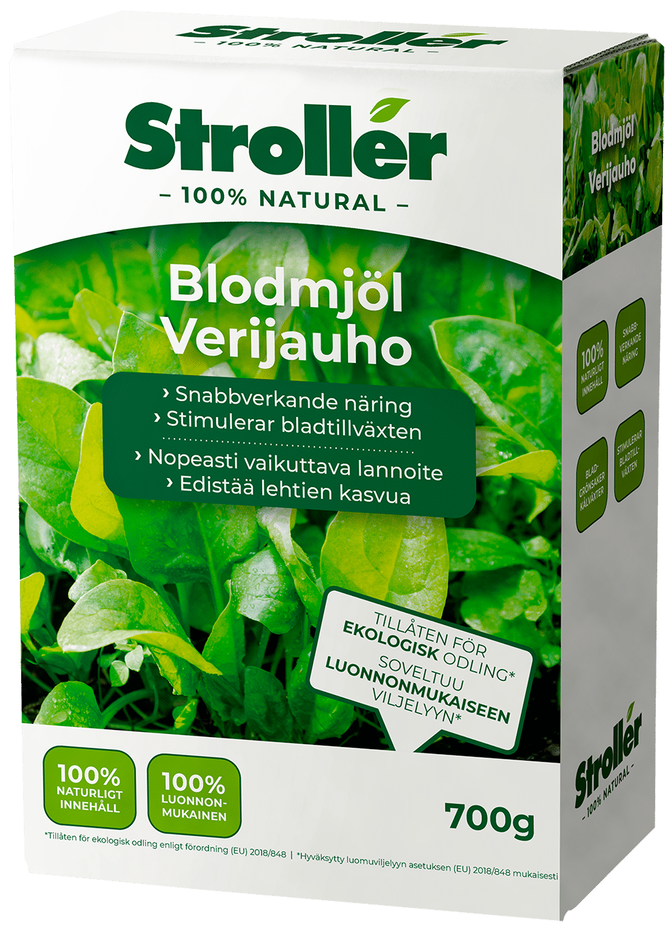 Stroller Blodmjöl är ett snabbverkande gödsel med högt innehåll av kväve. Den stimulerar framför allt bladtillväxten och lämpar sig därför extra bra till bladgrönsaker.