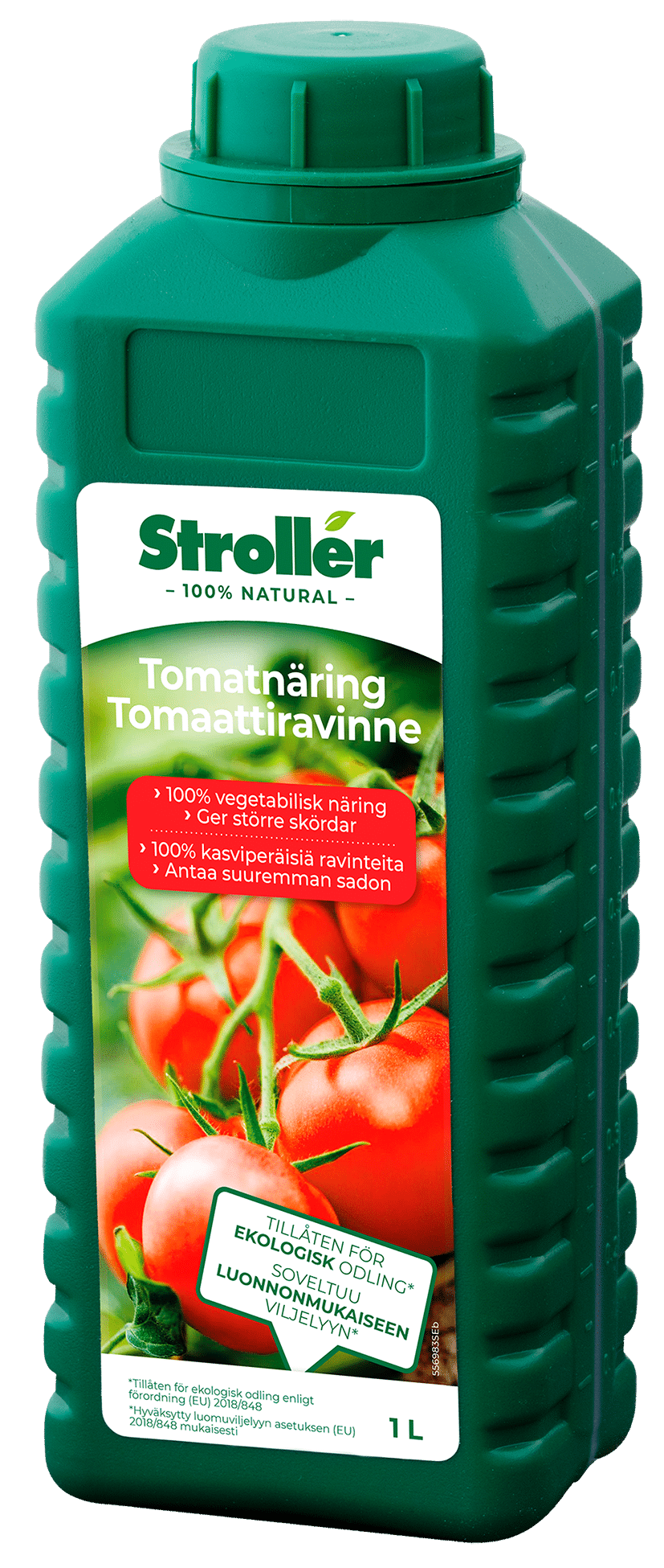 Stroller Tomatnäring är en 100 % vegetabilisk och långtidsverkande flytande näring. Tomatnäringen består av en blandning av torv och aska från brända solrosfrön, samt humus och fulvosyra. Främjar rotbildning och tillväxt vilket ger starka och friska tomatplantor. Bevattningsbehovet minskar med upp till 30 %.